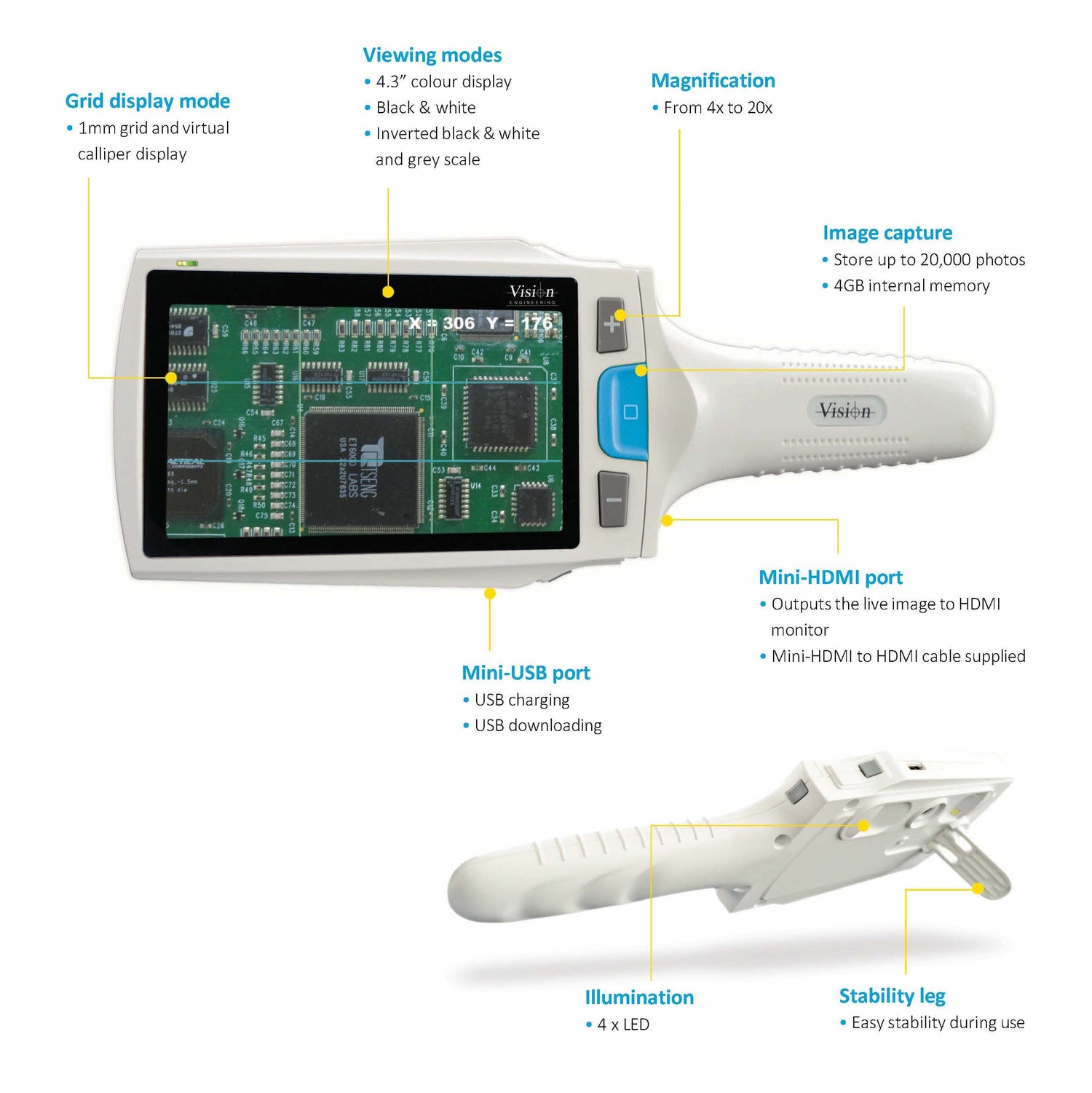 Camβ ist eine portable, digitale Handlupe für die mobile Inspektion. Dieses robuste Prüf- und digitale Erfassungstool mit 4- bis 20-facher Vergrößerung ist ideal für den Einsatz unterwegs, in der Werkstatt oder auch für Schwersichtige. Geliefert mit 4,3-Zoll-Display und LED-Beleuchtung.